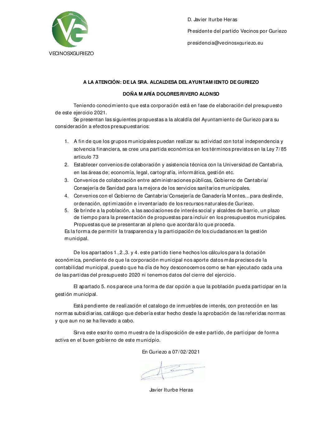 PROPUESTAS DE MEJORA DEL GRUPO MUNICIPAL VECINOS X GURIEZO