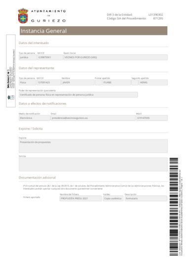 VECINOS X GURIEZO ha registrado en el ayto. de Guriezo una petición acordada en asamblea celebrada en fecha 03 /02/2021.